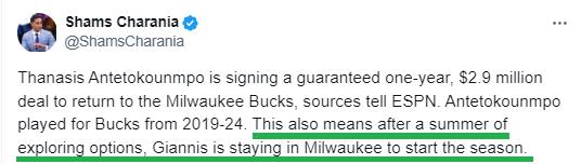 Cần lưu ý rằng các shams nhấn mạnh trong tweet của mình rằng antetokounmpo ở lại sau cả một mùa hè khám phá.
