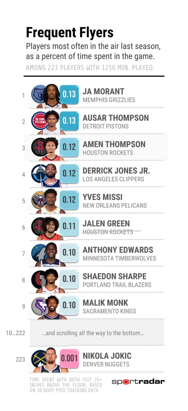 {3 đưa Nuggets Center Jokic ở lại vào thời điểm ngắn là 0,001%, xếp hạng cuối cùng! (Thống kê này bao gồm 223 người chơi đã chơi hơn 1250 phút mùa trước)